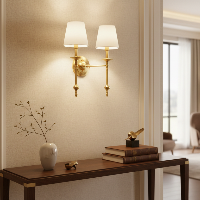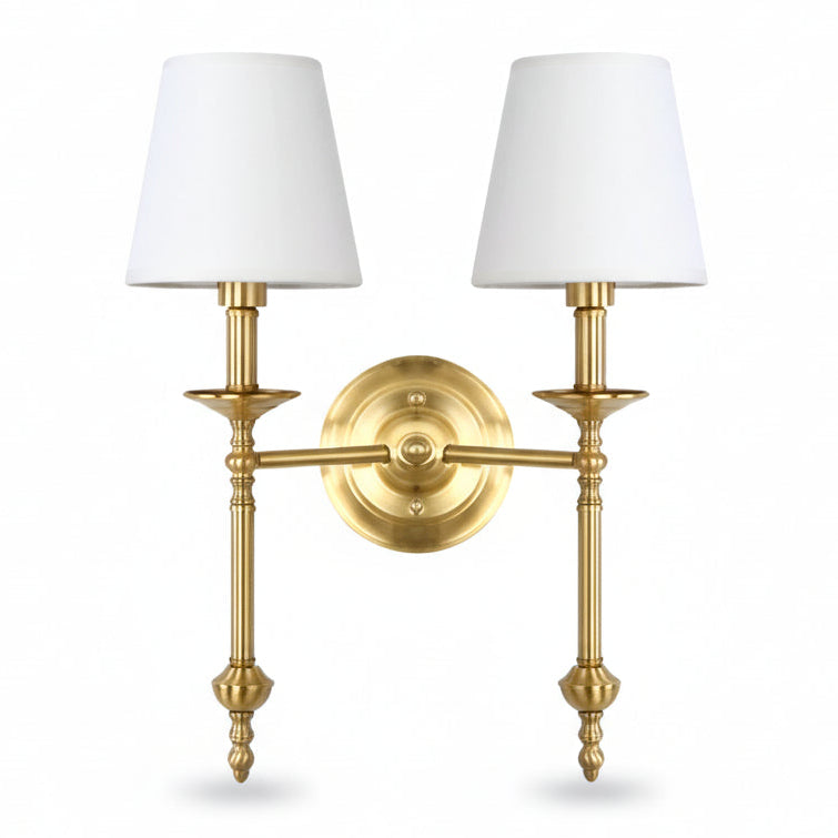 A Arandela de Parede Tocheiro Dupla une elegância contemporânea e sofisticação clássica em um único design. Produzida em **cobre de alta qualidade, com duas cúpulas em tecido branco, é a escolha perfeita para quem busca iluminação decorativa com personalidade e acabamento refinado.