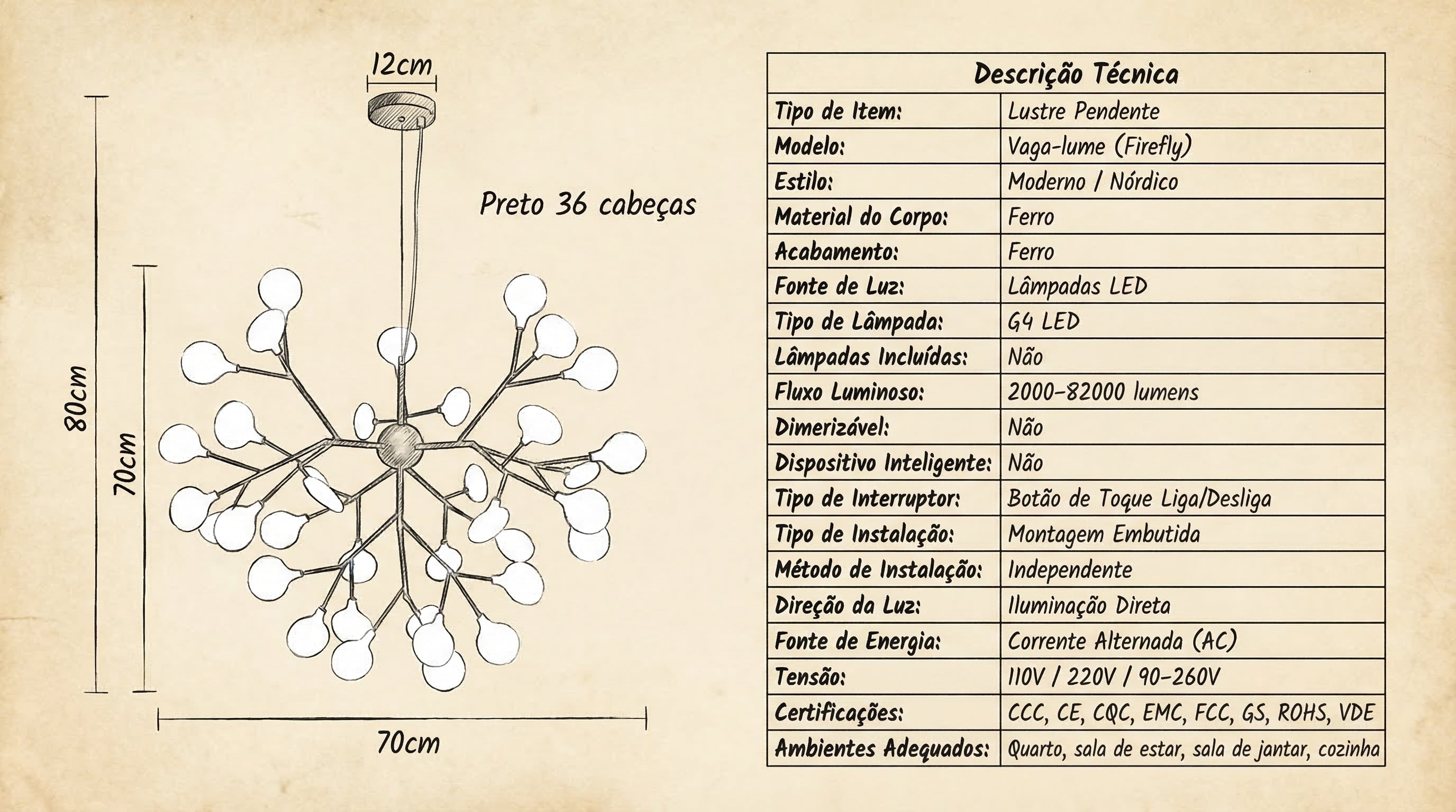 Com design de estilo nórdico moderno, o lustre Firefly possui estrutura em ferro resistente, oferecendo durabilidade e um visual clean com toque industrial. Sua iluminação em LED G4 proporciona eficiência energética e um efeito decorativo encantador, ideal para quem valoriza estética e funcionalidade.